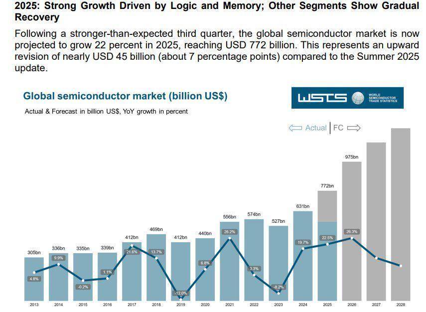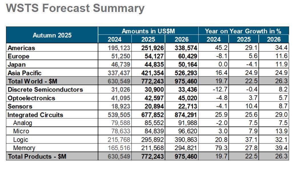 而美光正好同时卡正在这三块焦点存储范畴:HBM、办事器DRAM(包罗 DDR5/LPDDR5X)、以及高端数据核心SSD,由于AI数据核心需要更大且更高贵的高机能硬盘。高于WSTS春季给出的瞻望;但华尔街阐发师们估计接下来的两年增加将有所放缓可是比拟于其他AI算力类厂商仍然强劲,2026年半导体市场总价值则无望正在2025年的强劲增加根本之上大举扩张至9755亿美元,涵盖文本/图像/音频/视频。